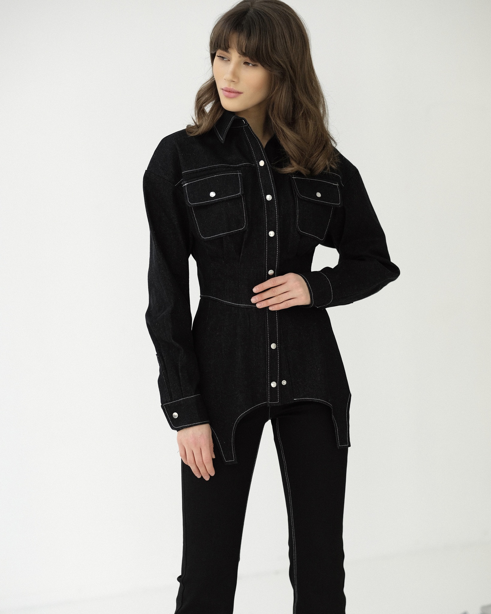 - Рекомендуем сочетать в тандеме с рубашкой-корсетом из чёрной джинсы